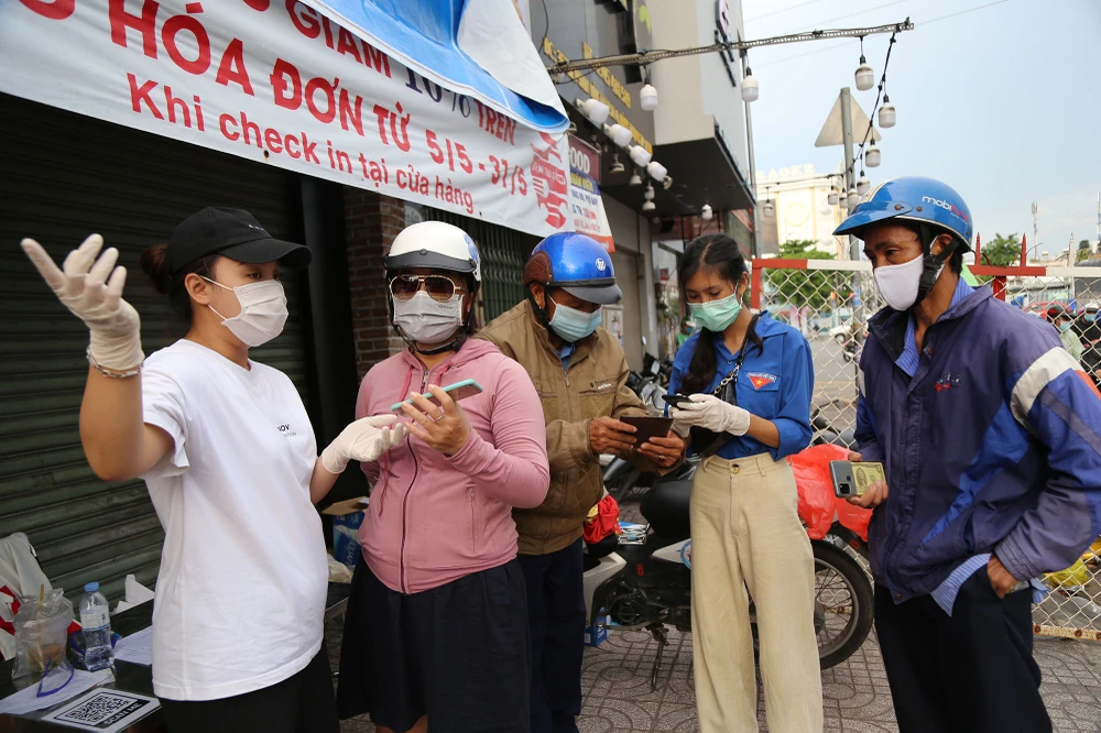 Các tình nguyện viên hỗ trợ hướng dẫn người dân khai báo y tế. Ảnh: HOÀNG GIANG