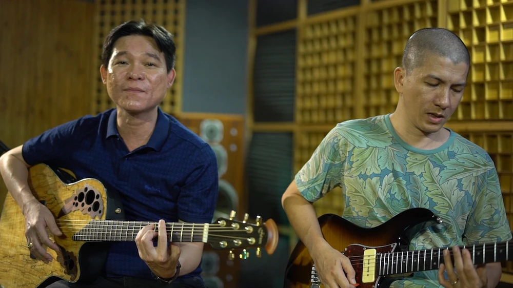 Nhạc sĩ Quốc An và Hoài An trong phòng thu Ngộ. Ảnh: Nhân vật cung cấp