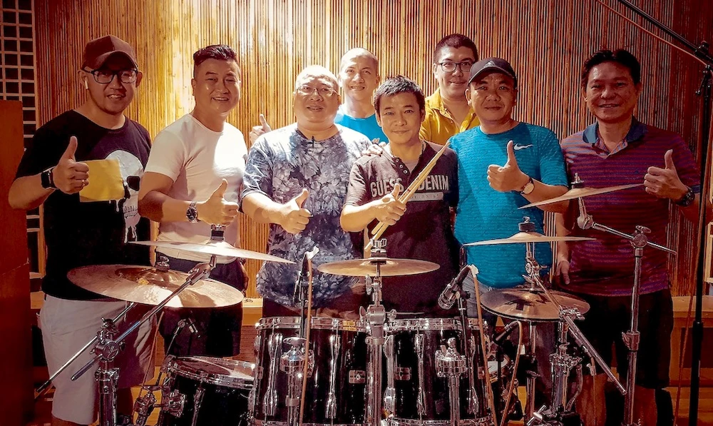Đạo diễn Kiki Trần (ngoài cùng bên trái) cùng các nhạc sĩ, êkíp thực hiện Ngộ. Ảnh: Nhân vật cung cấp