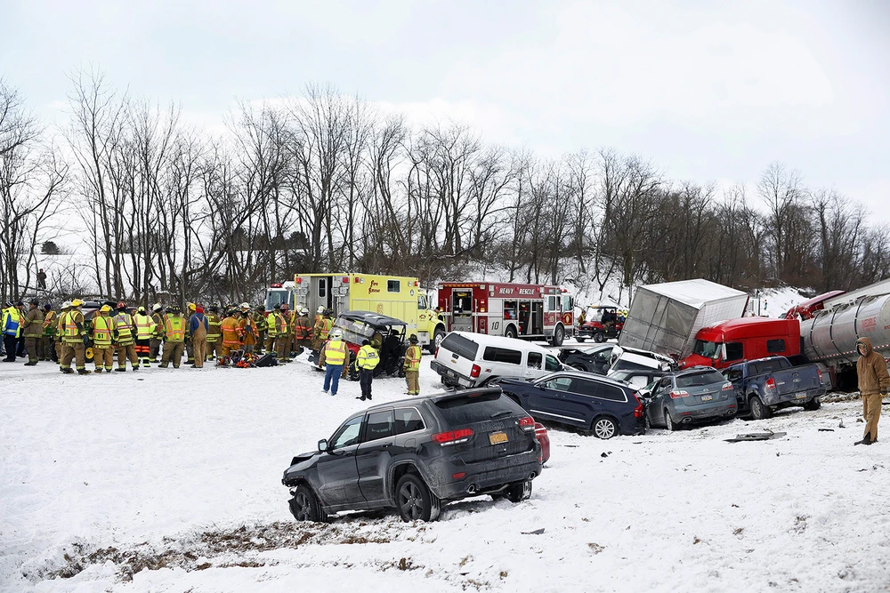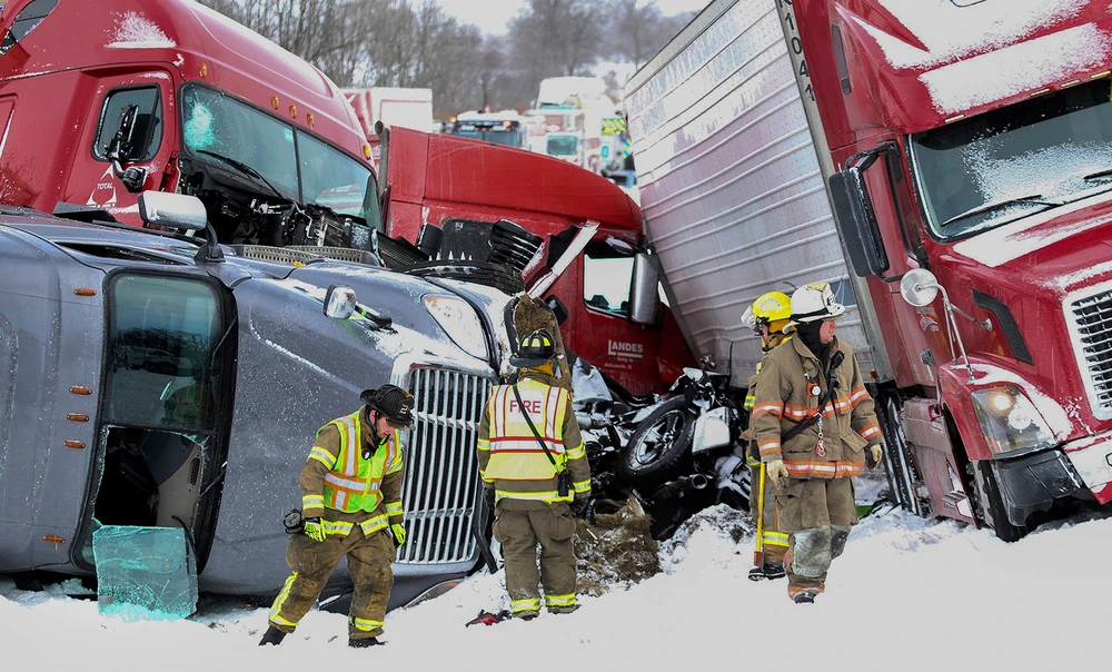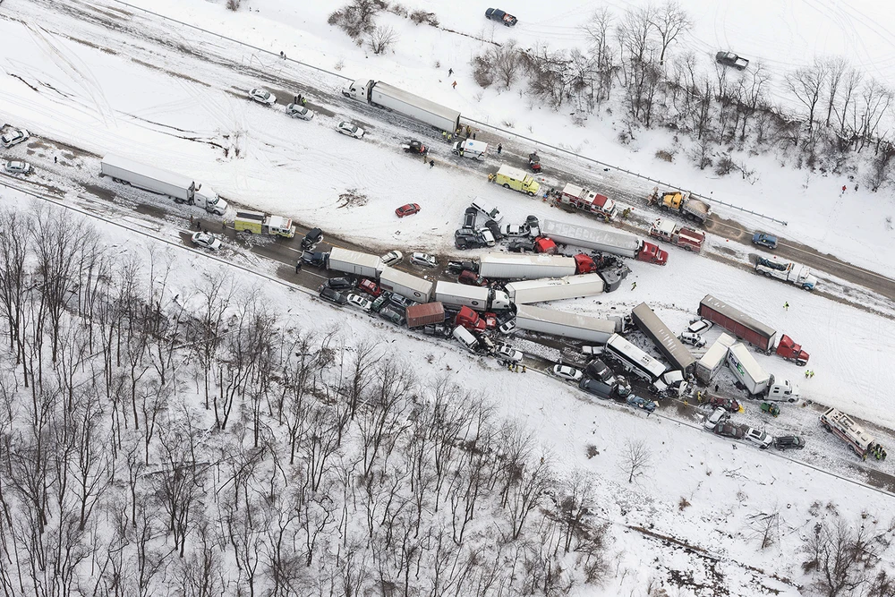 Cảnh sát khu vực cho biết trong số 64 chiếc xe gây tai nạn trên, có nhiều xe container, xe rơmoóc nằm ngổn ngang trên đường cao tốc.