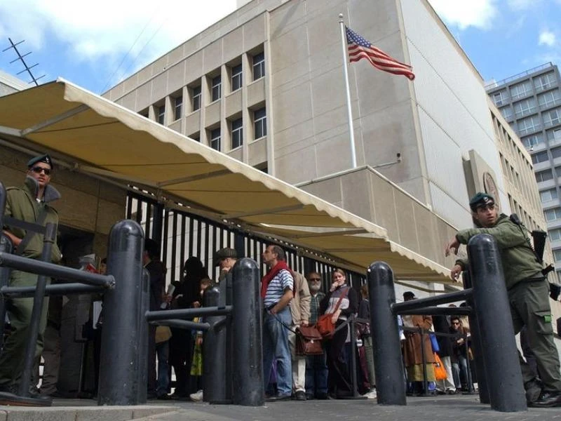 Cảnh vệ có vũ trang bên ngoài đại sứ quán Mỹ ở Tel Aviv. Ảnh: AP