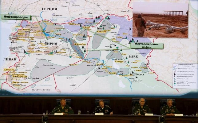 Các quan chức thuộc Bộ Quốc phòng Nga trình bày những bằng chứng hoạt động buôn dầu ở biên giới Thổ Nhĩ Kỳ-Syria ở Moscow ngày 2-12. Ảnh: Reuters