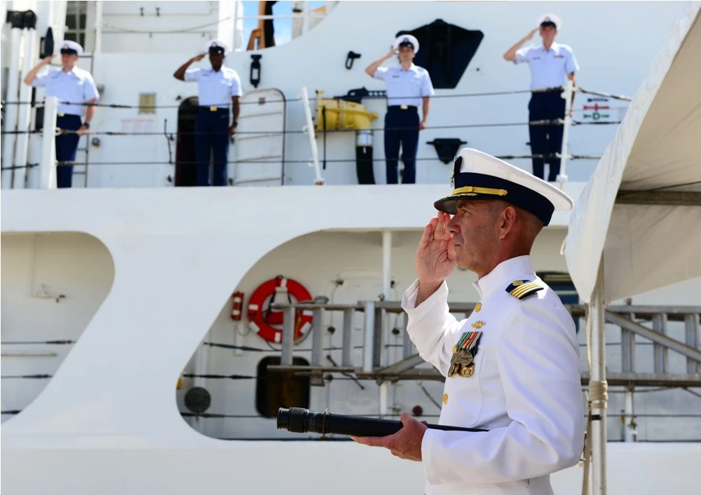 Đại úy Ted St. Pierre, sĩ quan chỉ huy của cựu Tàu Tuần duyên Morgenthau, chào trong lễ bàn giao tại Căn cứ Tuần duyên Honolulu.