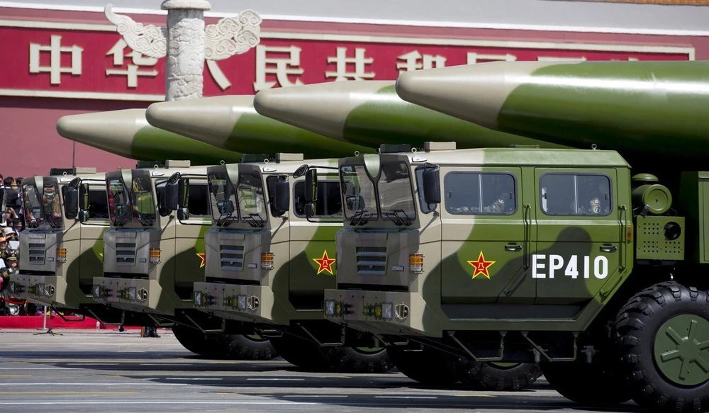Đoàn xe quân sự mang tên lửa đạn đạo DF-26 tham gia lễ duyệt binh kỷ niệm 70 năm kết thúc Thế chiến II ở Bắc Kinh, Trung Quốc, năm 2015. Ảnh: REUTERS
