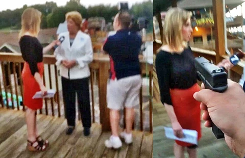 Biên tập viên Alison Parker đang phỏng vấn bà Vicky Gardner (ảnh trái) và Vester Flanagan móc súng bắn. Ảnh: TWITTER
