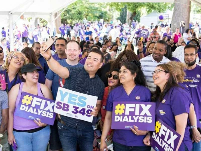 Những người biểu tình ở bang California ủng hộ dự luật của thượng nghị sĩ Ricardo Lara. Ảnh: SEIU-UHW