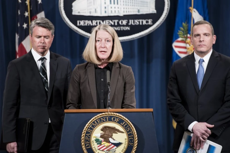 Các quan chức Bộ Tư pháp Mỹ thông báo cáo trạng đối với bốn cá nhân người Nga về tấn công mạng Yahoo!. Ảnh: AFP