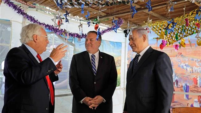 Thủ tướng Israel Benjamin Netanyahu (phải), Đại sứ Mỹ tại Israel David Friedman (giữa) và Ngoại trưởng Mỹ Mike Pompeo (trái) trong cuộc gặp ngày 18-10. Ảnh: AFP