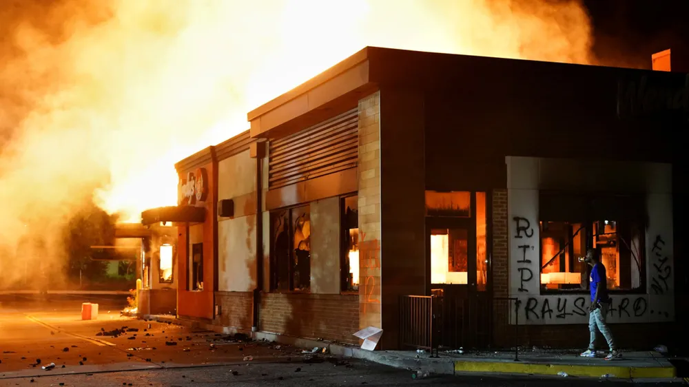 Nhà hàng Wendy, nơi Brooks bị hai viên cảnh sát người da trắng bắn, cũng đã bị người biểu tình đốt cháy vào tối 13-6. Ảnh: RT