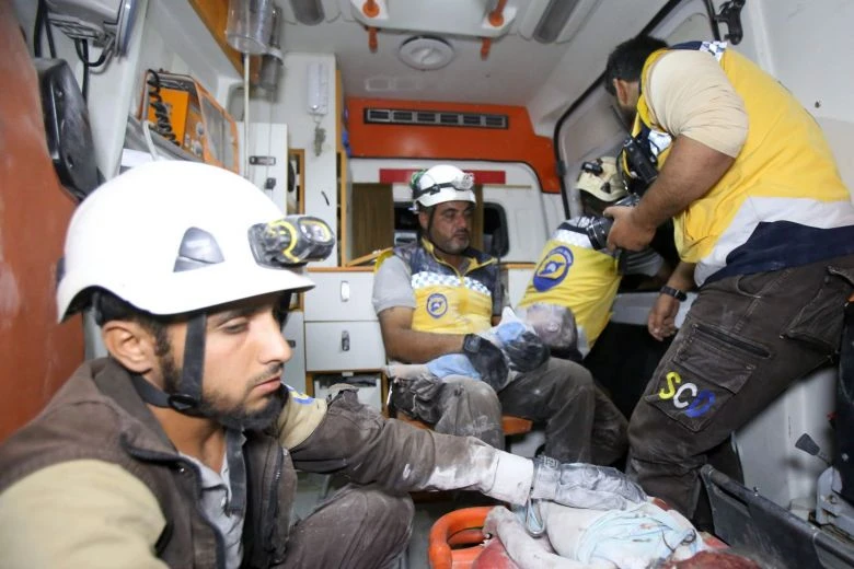 Các nhân viên của "Mũ bảo hiểm trắng" (SCD) tham gia cứu hộ một nạn nhân của các vụ tấn công tại tỉnh Idlib, Syria hồi tháng 8-2019. Ảnh: AFP