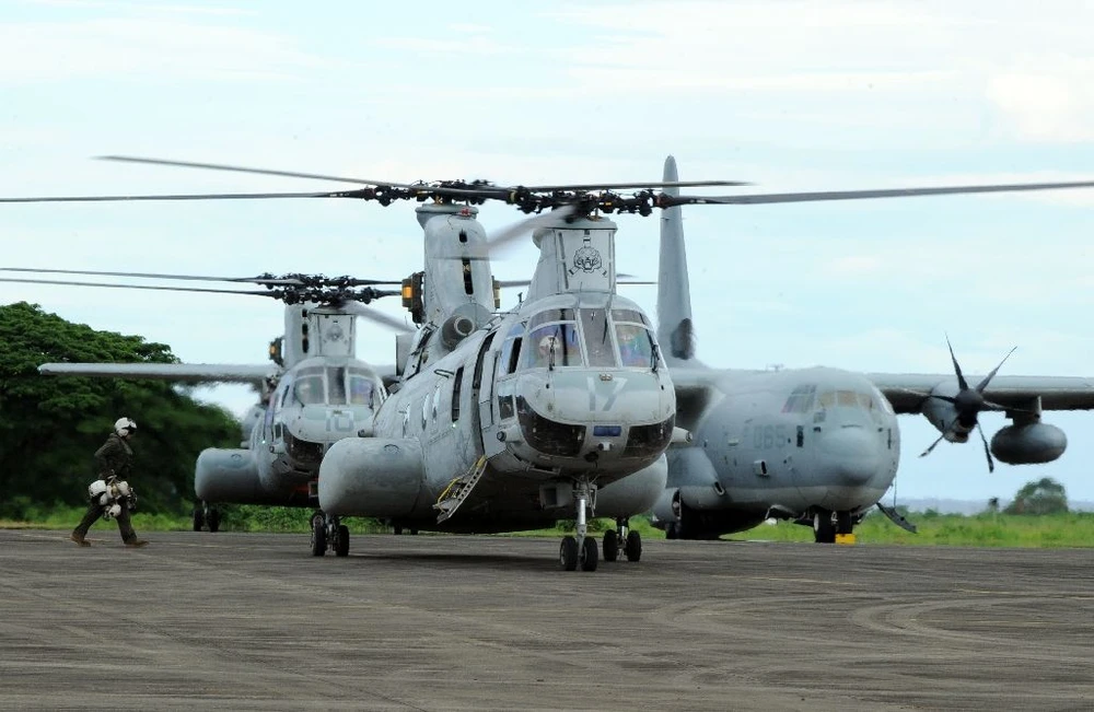 Hai trực thăng chiến đấu Mỹ tại một căn cứ dã chiến của thủy quân lục chiến Mỹ ở nam Manila (Philippines). (Ảnh: AFP)