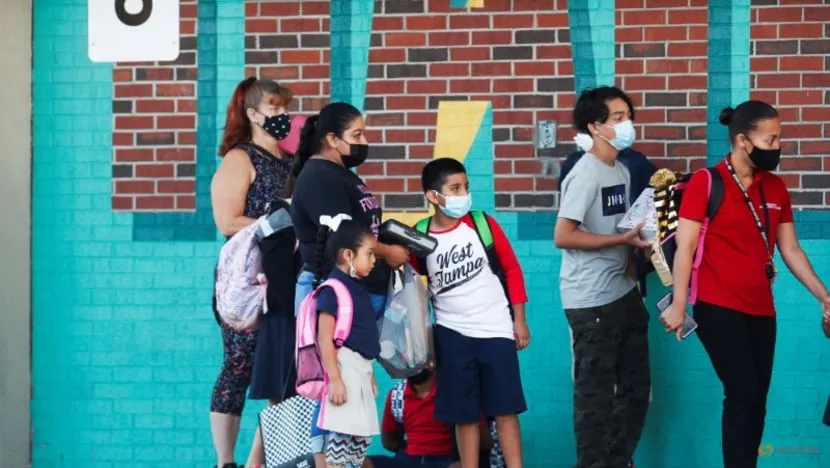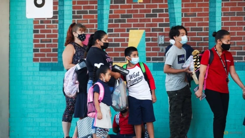 Phụ huynh dắt con đi học trong ngày đầu tiên tụ trường tại trường tiểu học West Tampa ở Florida, Mỹ, ngày 10-8. Ảnh: REUTERS