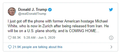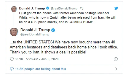 “Tôi vừa gọi điện nói chuyện với ông Michael White, ông ta hiện đang ở Zurich, Thụy Sĩ sau khi được thả ra khỏi Iran. Ông ấy sẽ được đưa về nhà bằng máy bay của Mỹ trong thời gian ngắn thôi” - ông Trump viết trên trang Twitter của mình hôm 4-6.