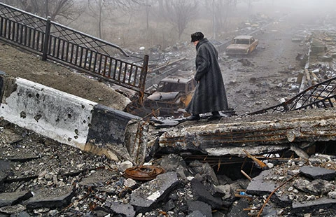 Quang cảnh đổ nát do chiến tranh ở Donetsk (miền Đông Ukraine) ngày 1-3. Ảnh: AP