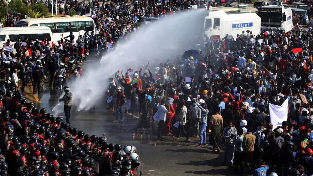 Cảnh sát Myanmar dùng vòi rồng trấn áp người biểu tình. Ảnh: SKY NEWS