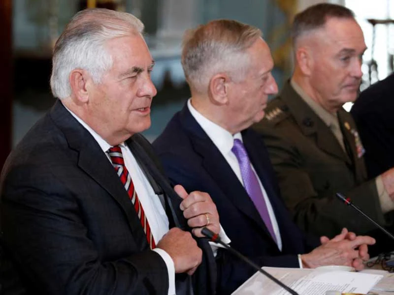 Ngoại trưởng Mỹ Tillerson (trái), Bộ trưởng Quốc phòng Mỹ Mattis (giữa) tại Đối thoại Ngoại giao và An ninh Mỹ-Trung ngày 21-6 tại Mỹ. Ảnh: REUTERS