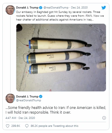 Đầu tuần trước, Tổng thống Trump đã viết trên trang Twitter của mình rằng ông sẽ "buộc Iran phải chịu trách nhiệm" nếu "một người Mỹ bị giết". Cảnh báo được đưa ra sau khi ông Trump cáo buộc Iran nhắm mục tiêu vào Đại sứ quán Mỹ ở Baghdad trong một vụ tấn công bằng tên lửa.