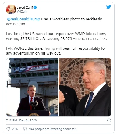 Ngoại trưởng Iran Javad Zariff ngay sau đó đã bác bỏ lời chỉ trích, lưu ý Tổng thống Trump đang sử dụng “hình ảnh vô giá trị để buộc tội Iran một cách liều lĩnh”, Sputnik đưa tin.