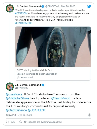 CENTCOM thông báo trên trang Twitter của mình rằng hai máy bay ném bom chiến lược B-52H Stratofortress của Mỹ, có khả năng mang cả vũ khí hạt nhân và thông thường, đã bay từ căn cứ không quân Minot ở bang Bắc Dakota đến khu vực Vịnh Ba Tư.