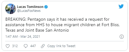 Phát biểu trước các phóng viên hôm 23-3, người phát ngôn Lầu Năm Góc John Kirby tiết lộ Bộ Y tế và Dịch vụ Nhân sinh Mỹ (HHS) đã đề nghị sử dụng căn cứ quân sự liên hợp San Antonio và Fort Bliss ở bang Texas để chuyển một số đứa trẻ tại các trung tâm quản lý trẻ nhập cư trái phép sang.