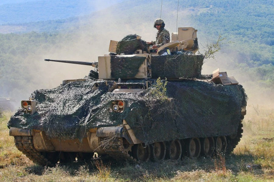Xe chiến đấu bộ binh M2A3 Bradley của Mỹ tham gia tập trận tại bãi tập quân sự Novo Selo (Bulgaria) năm 2018. Ảnh: JAMAR MARCEL PUGH/U.S. ARMY/STARS AND STRIPES