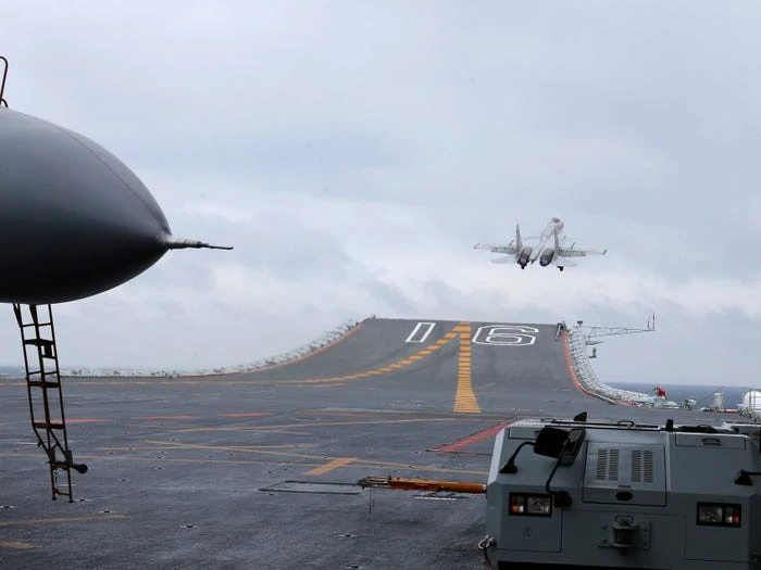 Máy bay chiến đấu J-15 cất cánh từ tàu sân bay Liêu Ninh đi tham gia một cuộc tập trận ở Biển Đông. Ảnh: REUTERS