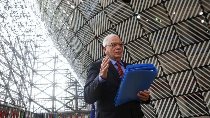 Đại diện cấp cao về chính sách đối ngoại của EU Josep Borrell phát biểu trước truyền thông trước cuộc họp của Các Ngoại trưởng châu Âu tại trụ sở Hội đồng châu Âu ở Brussels (Bỉ) hôm 22-3. Ảnh: Aris Oikonomou, Pool Photo/ AP