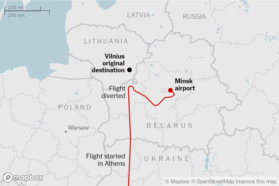 Ngày 23-5, Belarus đã yêu cầu chuyến bay mang số hiệu FR4978 của hãng Ryanair - khởi hành từ sân bay quốc tế Athens (Hy Lạp) tới sân bay quốc tế Vilnius (Lithuania) - phải chuyển hướng và hạ cánh khẩn cấp tại sân bay quốc tế Minsk.
