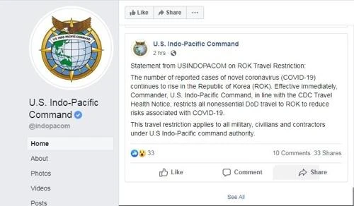 Trang Facebook của Bộ Chỉ huy Ấn Độ Dương-Thái Bình Dương vào ngày 26-2 thông báo việc hạn chế du lịch đến Hàn Quốc. Ảnh: YONHAP