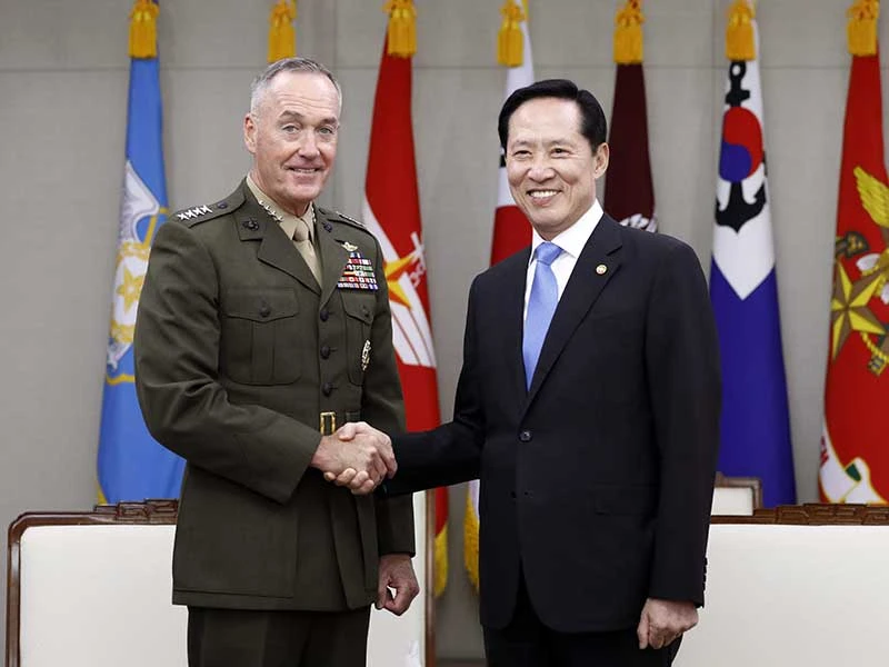 Chủ tịch Hội đồng Tham mưu trưởng quân đội Mỹ Joseph Dunford (trái) gặp Bộ trưởng Hàn Quốc Song Young-moo ngày 14-8. Ảnh: AP
