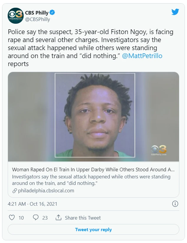 SEPTA cho biết một trong những nhân viên của họ đã phát hiện vụ cưỡng hiếp và gọi ngay cho cảnh sát. Nghi phạm là một người đàn ông 35 tuổi có tên là Diston Ngoy và ngồi gần nạn nhân trên chuyến tàu.