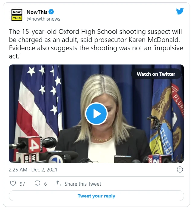 Công tố viên hạt Oakland Karen McDonald cho biết nghi phạm 15 tuổi trong vụ xả súng ở trường trung học Oxford sẽ bị xét xử khi đến tuổi trưởng thành. Ảnh: TWITTER