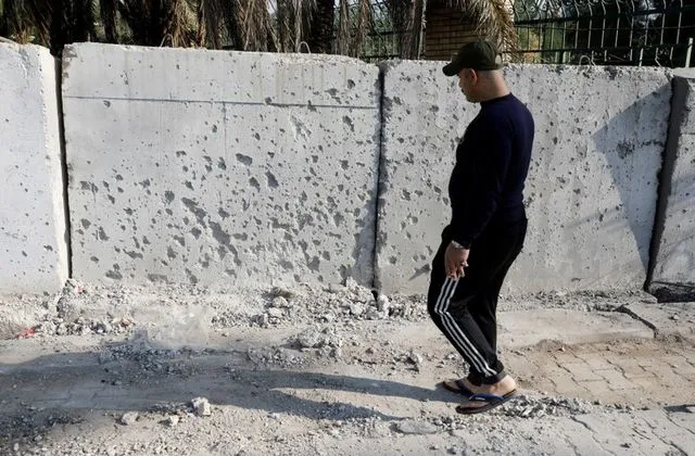 Một người đàn ông xem xét thiệt hại khu vực bị tên lửa rơi trúng bên trong Vùng Xanh ở Baghdad, Iraq ngày 18-11. Ảnh: REUTERS