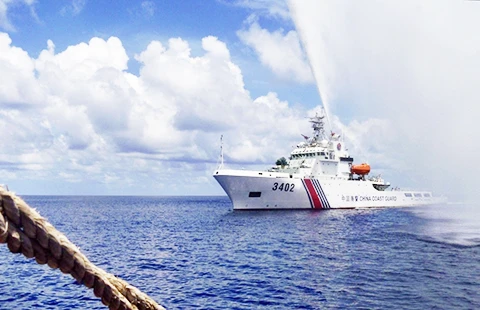 Tàu cảnh sát biển Trung Quốc đến gần tàu cá Philippines ở bãi cạn Scarborough. Ảnh: AP