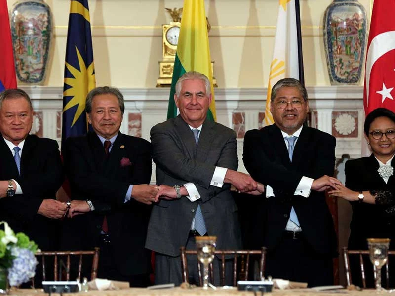 Ngoại trưởng Mỹ Rex Tillerson (giữa) cùng các bộ trưởng ngoại giao ASEAN tại Mỹ ngày 4-5. Ảnh: REUTERS