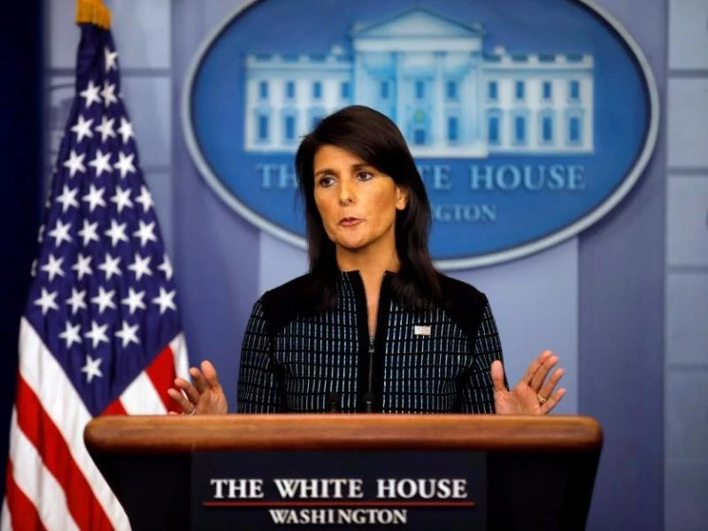 Đại sứ Mỹ tại Liên Hiệp Quốc Nikki Haley trong một cuộc họp báo ở Nhà Trắng tuần trước. Ảnh: REUTERS