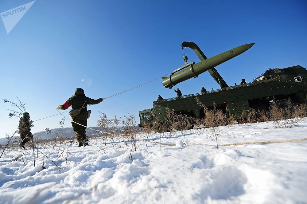Binh sĩ Nga theo dõi một xe vận chuyển đặt tên lửa tầm ngắn Iskander-M vào một bệ phóng trong một cuộc tập trận. Ảnh: SPUTNIK