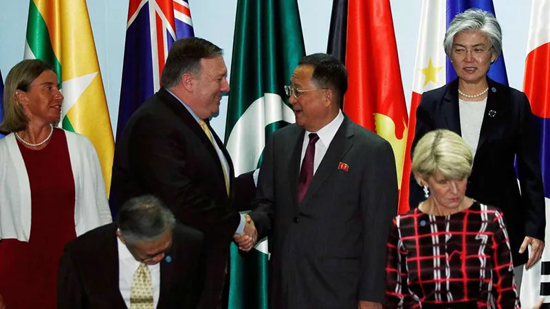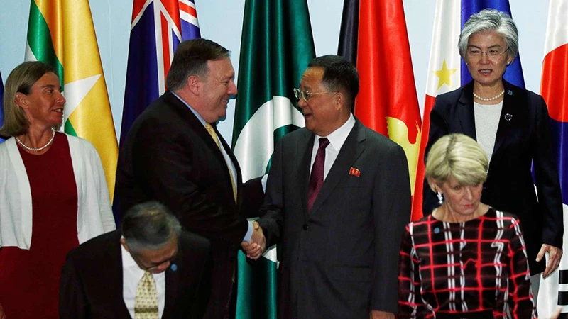 Ngoại trưởng Mỹ Mike Pompeo (trái) bắt tay cùng người đồng cấp Triều Tiên Ri Yong-ho tại diễn đàn ASEAN. Ảnh: REUTERS