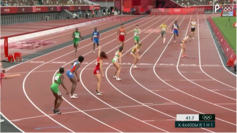 Đường chạy thứ 6 từ trái sang ở khu vực quy định nhận tín gậy không có VĐV Mỹ.