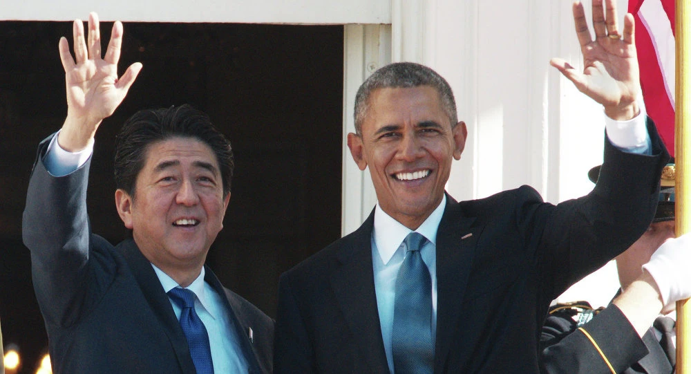 Tổng thống Mỹ Barack Obama và Thủ tướng Nhật Bản ông Shinzo Abe vẫy tay trong buổi lễ chào mừng chính thức diễn ra tại khu South Lawn của Nhà Trắng hôm 28-4-2015 (Nguồn: Sputnik News)