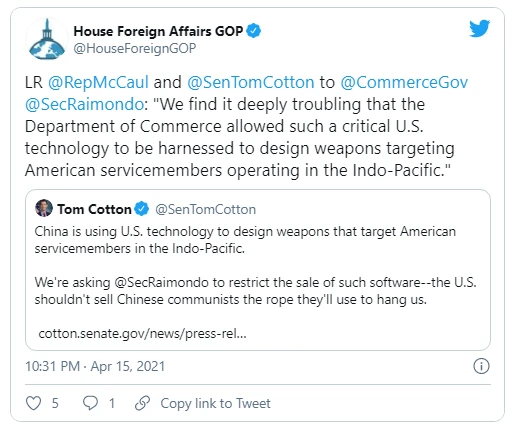 “Chúng tôi vô cùng lo lắng khi Bộ Thương mại cho phép một loại công nghệ quan trọng như vậy của Mỹ được sử dụng để thiết kế vũ khí nhắm vào các hoạt động của chúng ta ở khu vực Ấn Độ Dương - Thái Bình Dương” - các nhà lập pháp Mỹ viết.