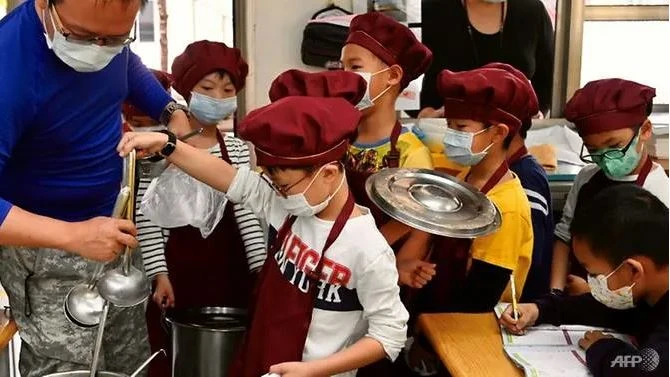 Học sinh một trường tiểu học ở TP Đài Bắc đều đeo khẩu trang để ngăn ngừa lây nhiễm COVID-19. Ảnh: AFP