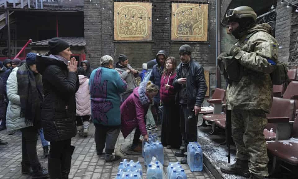 Lính Ukraine hỗ trợ nước sạch cho người dân ở TP Mariupol. Ảnh: AP