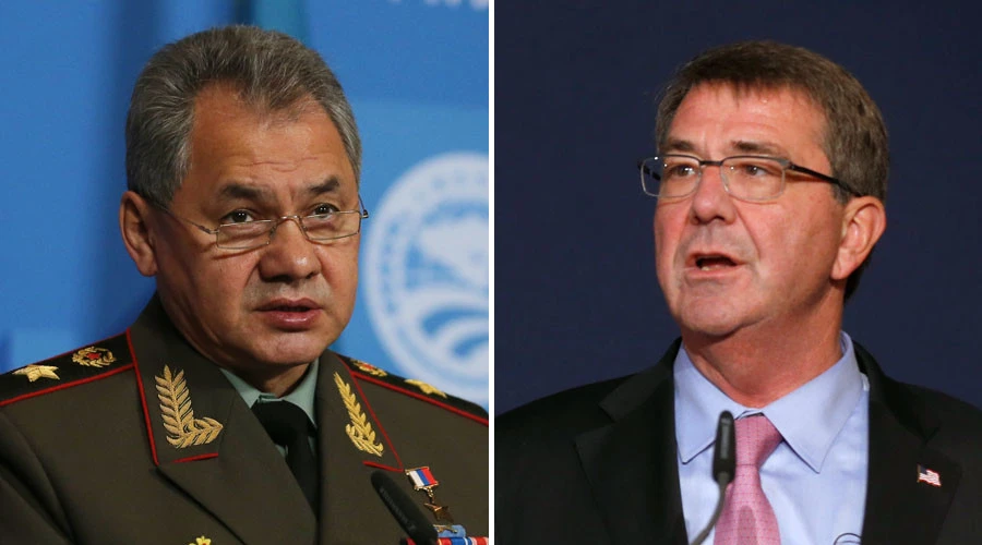 Bộ trưởng Quốc phòng Nga Sergei Shoigu (trái) và người đồng cấp Hoa Kỳ Ashton Carter (phải) thắt chặt liên lạc về tình trạng Syria. (Nguồn: Reuters)