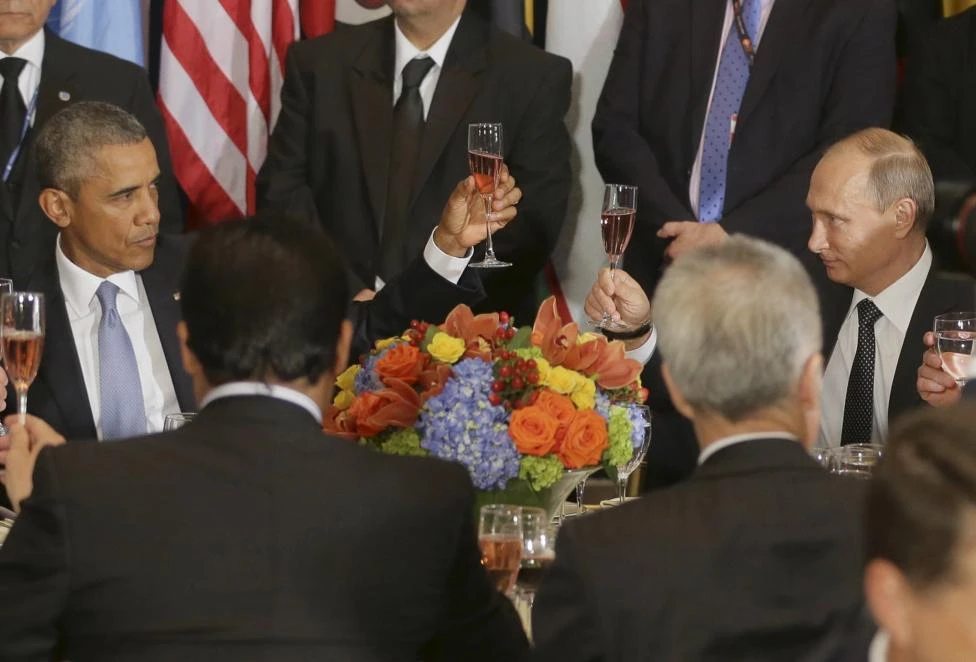Tổng thống Obama nâng ly cùng Tổng thống Putin sau cuộc họp (Ảnh: Reuters)