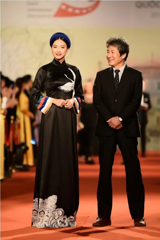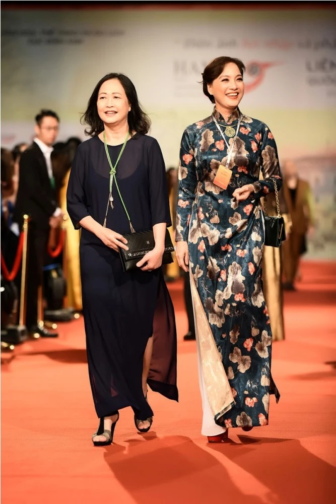 Ngô Thanh Vân (trái) với bộ áo dài màu đen.