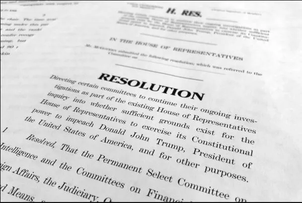 Bản nghị quyết từ Hạ viện Mỹ được đảng Dân chủ công bố để tiến hành các cuộc thẩm vấn kín điều tra luận tội tổng thống. Ảnh: AP