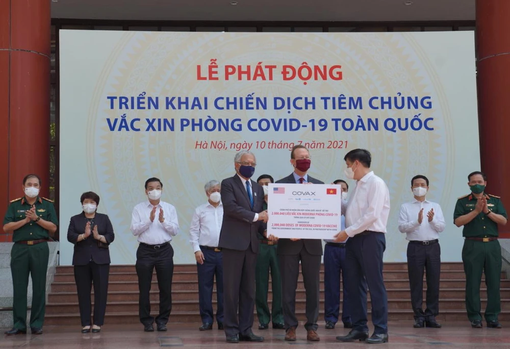 Lễ chuyển giao lô 2 triệu liều vaccine của Moderna mà Mỹ hỗ trợ cho Việt Nam. Ảnh: TLS MỸ