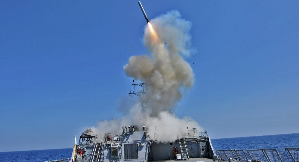 Tên lửa hành trình Tomahawk, loại tên lửa có đủ khả năng mang đầu đạn hạt nhân, được phóng đi từ chiến hạm USS Barry (lớp DDG 52) của Mỹ