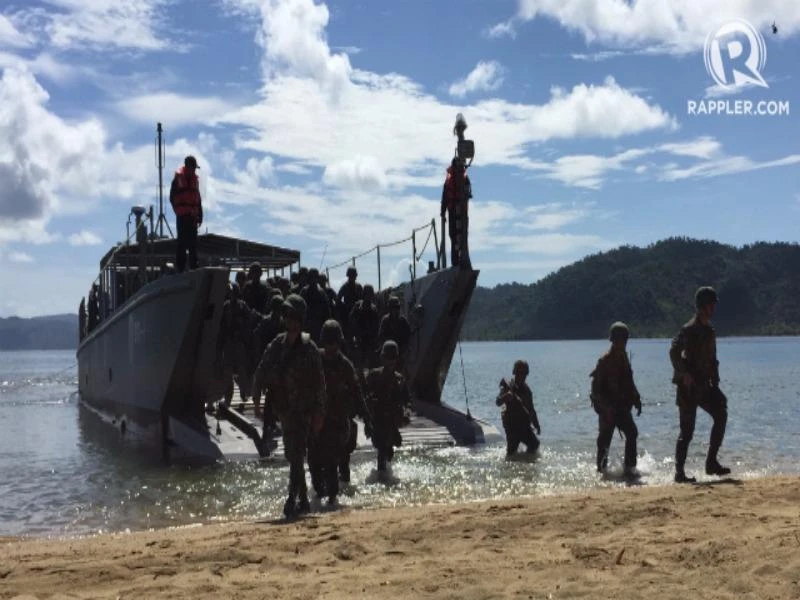 Tàu chở các binh sĩ Philippines cập bờ thị trấn Casiguran trong cuộc tập trận hôm 15-5. Ảnh: RAPPLER